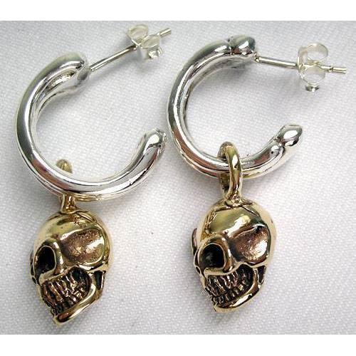 Ghoulish, ominous, fearsome; these devilish dangling earrings are designed only for the daring. Each earring features a 18k gold skull with gruesome gritted teeth and vacuous, cavernous eyes, hanging off of a thick sterling silver cuffed hoop.