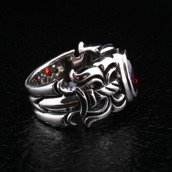 O assobio de uma lâmina e nosso anel de prata esterlina medieval Red Garnet toma o seu lugar. Inspirado pelos soldados lutadores desta época feroz, nosso anel usa prata esterlina altamente polida para um toque de luxo acessível. O cabo fortemente amarrado e a lâmina ameaçadora se curvam em torno do dedo, parecendo oferecer um escudo de proteção o tempo todo.