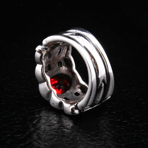 No rosto, uma pedra granada vermelha grande e facetada captura a luz e a atrai. Totalmente única e chamativa, ela não precisa cair nas sombras quando combinada com couro protetor e seu capacete exclusivo. Para os homens que não têm medo de dar um passo fora da norma no que diz respeito aos seus acessórios.