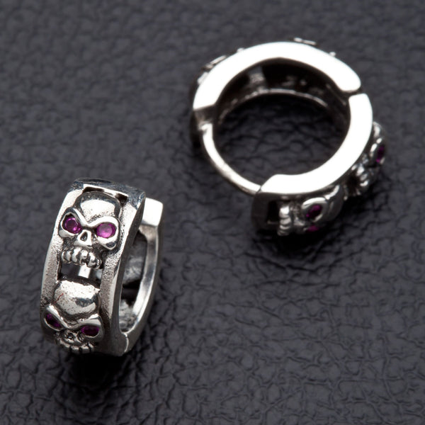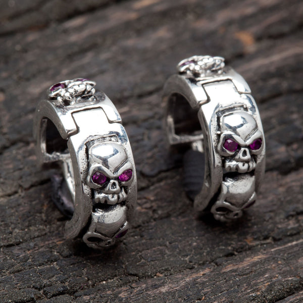 Prepare-se para brilhar com estes brincos de argola para homem, em prata de lei maciça. Terminados com o brilho de rubis vermelhos dentro dos olhos dos designs de caveira, esses brincos masculinos exclusivos são a maneira perfeita de finalizar seu visual.