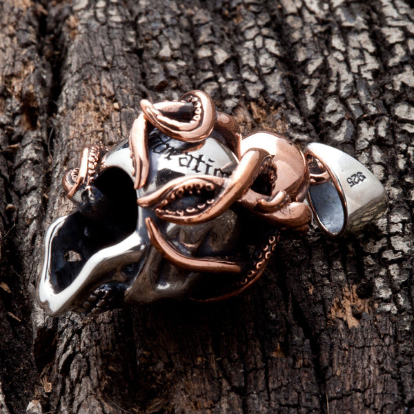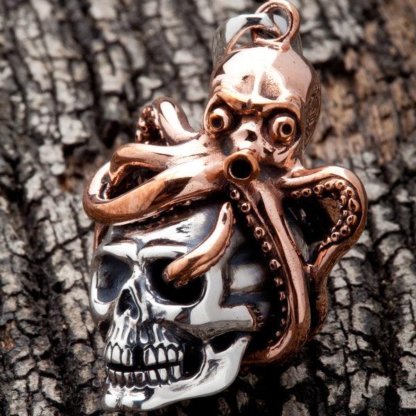 Um exemplo impressionante do talento de nossos joalheiros artesanais que criam nossas peças espetaculares; o pingente de polvo gótico é uma mistura de cores espetacular de prata esterlina sólida para a caveira e polvo de polvo de bronze que se empoleira precariamente no topo.