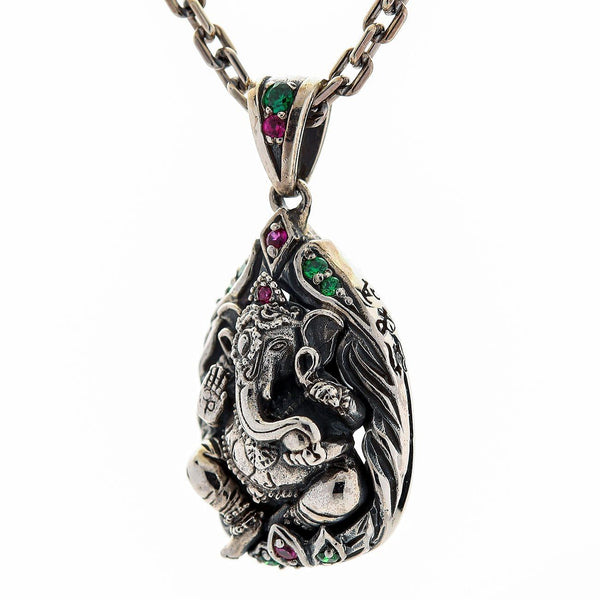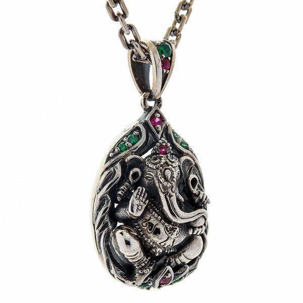 Esta joia de pescoço mostra uma das divindades hindus mais adoráveis, Ganesh, filho de Shiva e Parvati. A aparência de Ganesh é enganosa. A cabeça de um elefante e um corpo atarracado e robusto não parecem combinar bem. Mas Ganesh é o santo padroeiro das pessoas de mente sutil que não se deixam enganar pela aparência. Se você for capaz de ver uma divindade nesta criatura, ela se tornará um amigo leal a você. Como o deus da riqueza e da prosperidade, ele ajuda as pessoas nos negócios e remove obstáculos para aqueles que buscam o sucesso. Neste pingente, Ganesh é representado com quatro braços. Em duas de suas mãos, ele segura um laço, na terceira mão está o Ladoo, uma bola de farinha de grão de bico doce, e na quarta mão mostra o gesto de dotação. Como convém a uma divindade, Ganesh é cercado de tesouros - pedras preciosas com acabamento verde e rosa vibrante. Com seu olhar, ele mostra que está disposto a realizar seus desejos cobiçados, você só precisa respeitá-lo e acreditar em seus poderes.