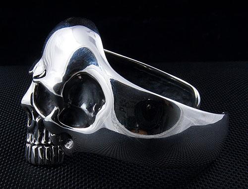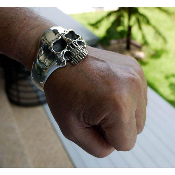 Esta linda pulseira clássica feita de prata esterlina é muito popular entre os visitantes do nosso site porque é única em muitos aspectos. Além do design volumoso que agrada a muitos, você certamente notará a bela maneira como o crânio é feito para se destacar bem no pulso. O comprimento da pulseira se estende por até 8,5 polegadas, e o peso desta pulseira é de 63 gramas. É, portanto, uma pulseira de punho muito sólida, espessa e bem polida que será um presente perfeito para muitos homens.