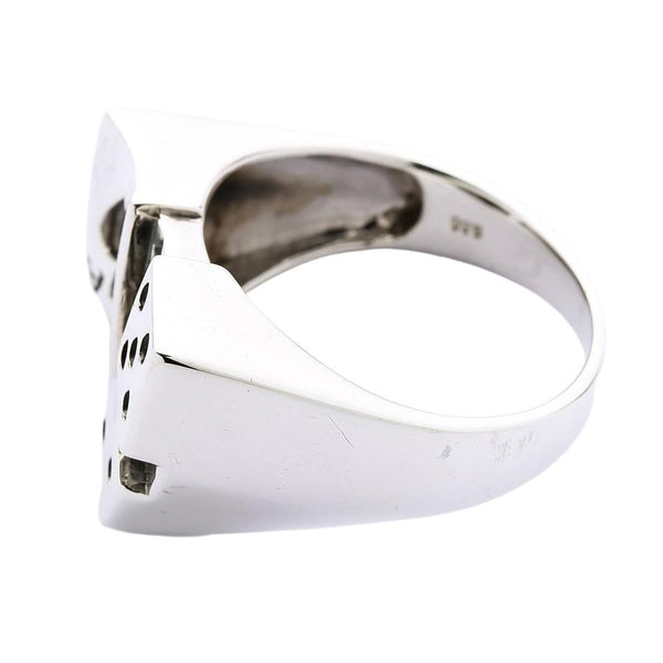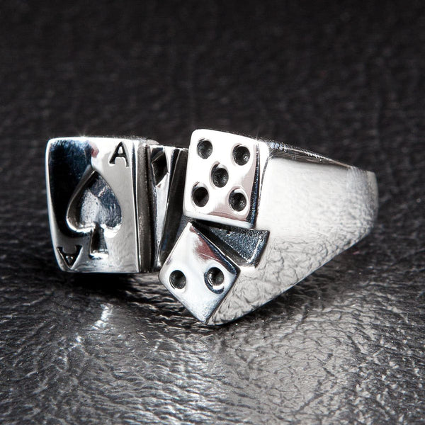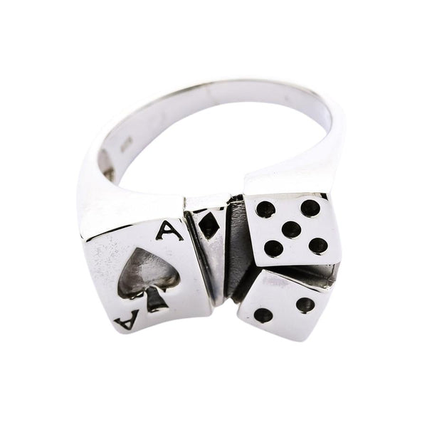 Arrisque-se e arrisque a sua mão na sorte ao descobrir este anel vestido para homem verdadeiramente único. Na face, mostra uma pilha de cartas de baralho e dois dados tradicionais. Desde o jogador até aqueles que se aventuram em apostas ímpares, este anel traz consigo uma sensação de sorte e boa fortuna. Ideal para o homem que precisa de um impulso de confiança.