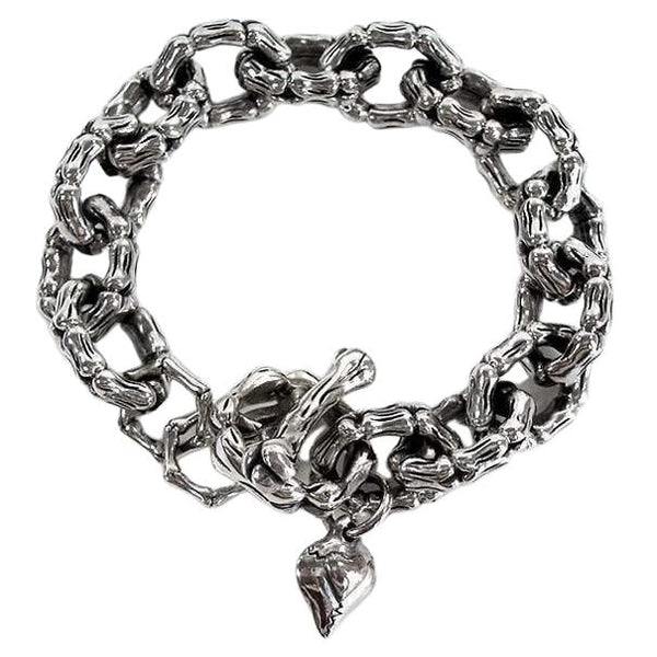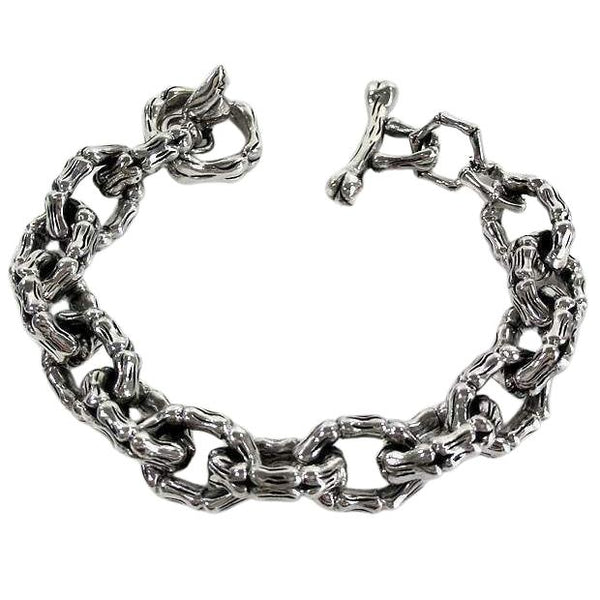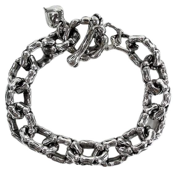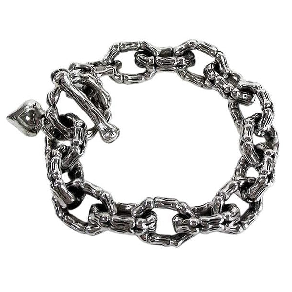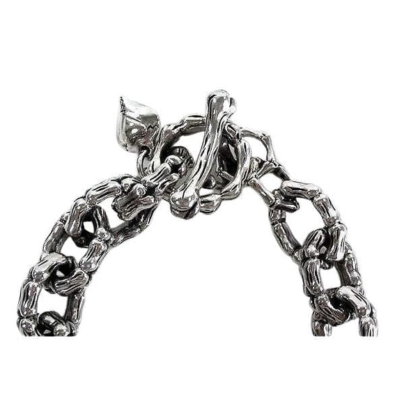Não fica mais pesado do que isso. Com 125 gramas de grossos elos em osso de esqueleto esculpidos de maneira complexa, completa com uma barra em T e um pequeno pendente de prata, nossa pulseira em osso de esqueleto é uma maneira séria de acentuar o seu estilo.