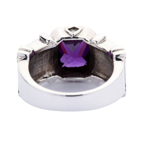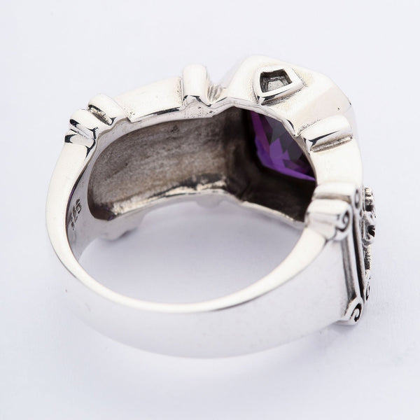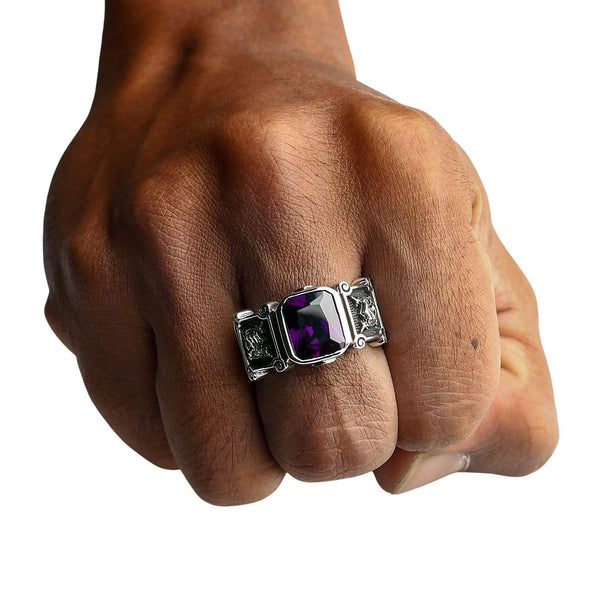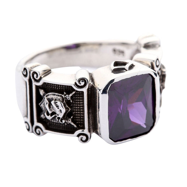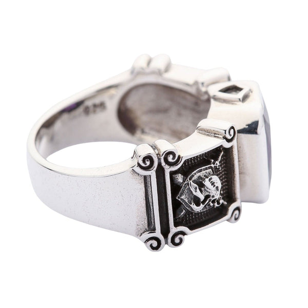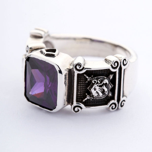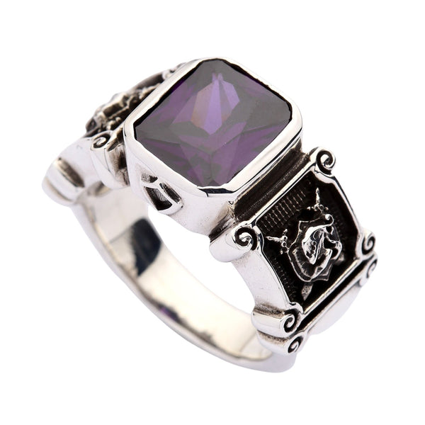 Это кольцо - один из тех аксессуаров, который без труда привлекает внимание. У него есть все необходимые для этого функции - солидный вид, роскошный вес, контраст светлого и темного, а также ослепительный блеск фиолетового аметиста, соединяющий все элементы воедино. Как будто этого было недостаточно, мы постарались добавить прямоугольные пластины с обеих сторон каменной вставки, чтобы добавить больше характера. Благодаря такому дизайну ваше кольцо становится еще более впечатляющим и грозным. Огромная каменная вставка благородного пурпурного цвета - это то, на что вы можете восхищаться, но кольцо предлагает гораздо больше. Возьмем, к примеру, рыцарскую символику. Мы воплотили его в виде щита со скрещенными мечами в виде гребня. Отсылки к рыцарству придают этому кольцу готические нотки, а затемненные элементы в сочетании с разбросанными то тут, то там завитками узорами свидетельствуют об этом.