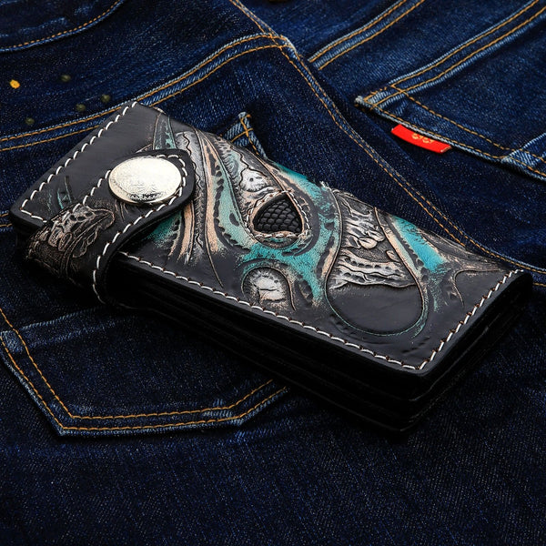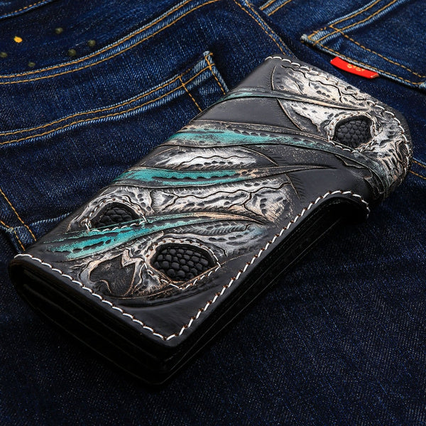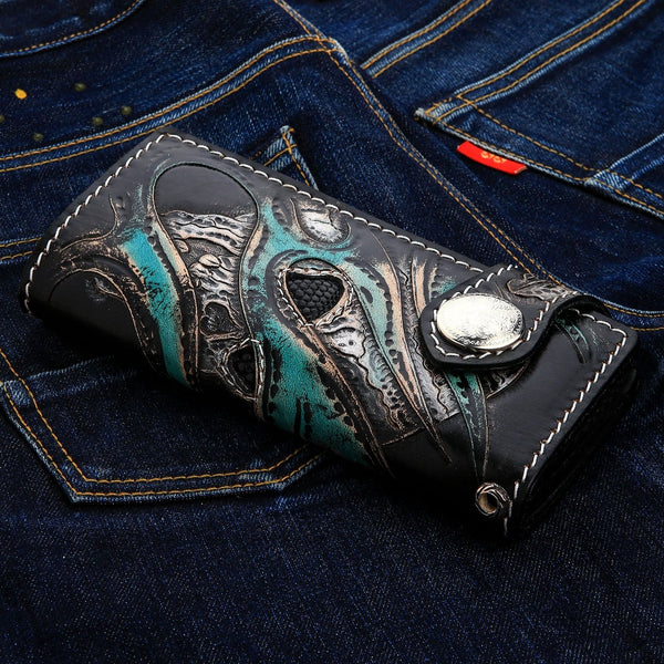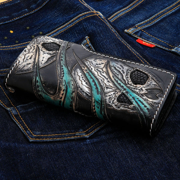Green Devil Skull Design Black Lizard Leather Biker Wallet